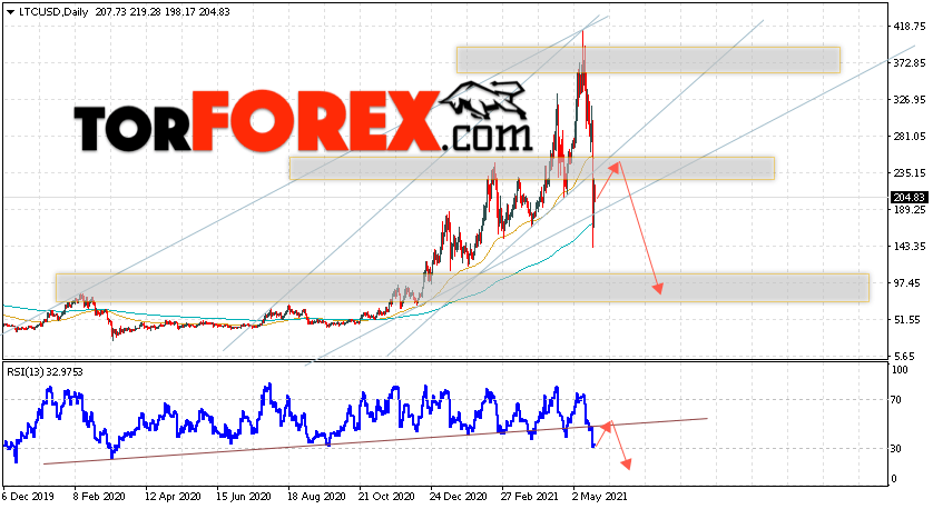 Дополнительным сигналом в пользу падения котировок LTC/USD на текущей торговой неделе 24 — 28 мая 2021 выступит тест линии сопротивления на индикаторе относительной силы. Вторым сигналом станет отскок от нижней границы бычьего канала. Отменой варианта падения цифрового актива Litecoin станет сильный рост цены и пробой области 295.05. Это укажет на пробой сопротивления и продолжение подъёма курса LTC/USD выше уровня 425.05. Подтверждением падения криптовалюты выступит пробой области поддержки и закрытие котировок ниже уровня 135.05.