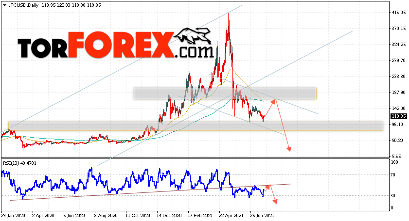 Дополнительным сигналом в пользу падения котировок LTC/USD на текущей торговой неделе 26 июля — 1 августа 2021 выступит тест линии сопротивления на индикаторе относительной силы. Вторым сигналом станет отскок от области сопротивления. Отменой варианта падения цифрового актива Litecoin станет сильный подъём цены и пробой области 195.05. Это укажет на пробой сопротивления и продолжение роста курса LTC/USD выше уровня 295.05. Подтверждением падению криптовалюты выступит пробой области поддержки и закрытие котировок ниже уровня 95.05.