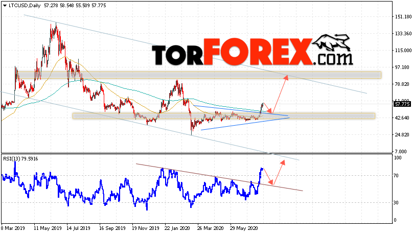 Дополнительным сигналом в пользу роста котировок LTC/USD на текущей торговой неделе 3 — 7 августа 2020 выступит тест пробитой линии тренда на индикаторе относительной силы. Вторым сигналом станет отскок от верхней границы модели «Треугольник». Отменой варианта подъёма цифрового актива Litecoin станет падение цен и пробой области 37.05. Это укажет на пробой области поддержки и продолжение падения курса LTC/USD ниже уровня 30.05. Подтверждением подъёма криптовалюты выступит пробой области сопротивления и закрытие котировок выше уровня 62.05.