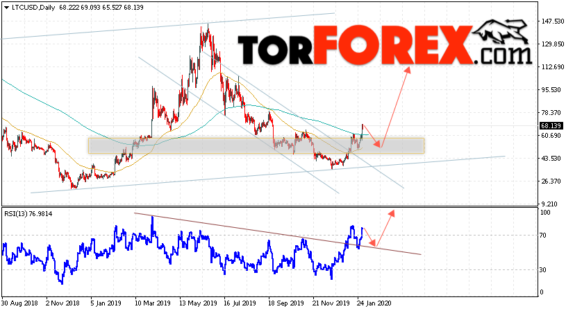 Дополнительным сигналом в пользу роста котировок LTC/USD на текущей торговой неделе 3 — 7 февраля 2020 выступит тест линии тренда на индикаторе относительной силы. Вторым сигналом станет отскок от области поддержки. Отменой варианта роста Litecoin станет падение и пробой области 35.05. Это укажет на пробой области поддержки и продолжение падения курса LTC/USD и падение ниже уровня 15.05. Подтверждением роста криптовалюты выступит пробой области сопротивления и закрытие котировок выше уровня 75.05.