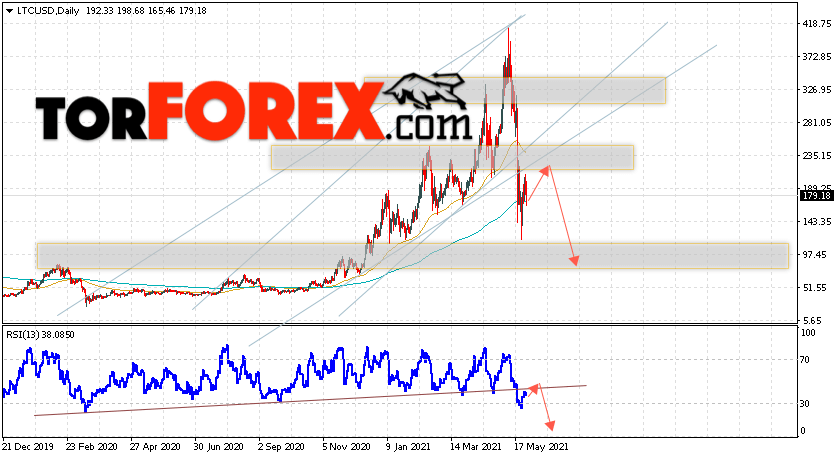 Дополнительным сигналом в пользу падения котировок LTC/USD на текущей торговой неделе 31 мая — 4 июня 2021 выступит тест линии сопротивления на индикаторе относительной силы. Вторым сигналом станет отскок от нижней границы бычьего канала. Отменой варианта падения цифрового актива Litecoin станет сильный рост цены и пробой области 275.05. Это укажет на пробой сопротивления и продолжение подъёма курса LTC/USD выше уровня 375.05. Подтверждением падения криптовалюты выступит пробой области поддержки и закрытие котировок ниже уровня 105.05.