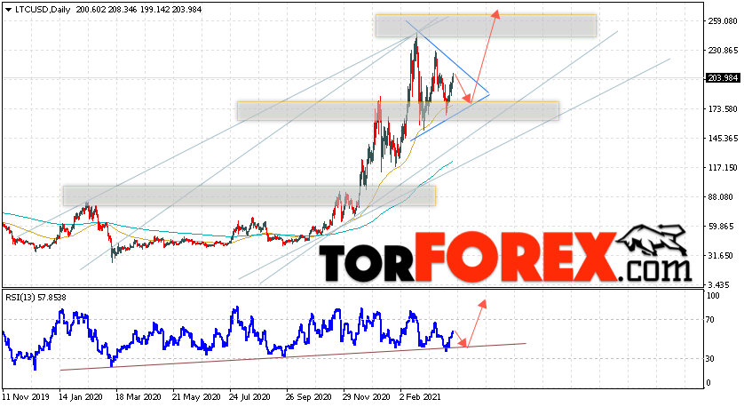 Дополнительным сигналом в пользу подъёма котировок LTC/USD на текущей торговой неделе 5 — 9 апреля 2021 выступит тест линии тренда на индикаторе относительной силы. Вторым сигналом станет отскок от нижней границы модели ”Треугольник”. Отменой варианта роста цифрового актива Litecoin станет падение цен и пробой области 135.05. Это укажет на пробой области поддержки и продолжение падения курса LTC/USD ниже уровня 75.05. Подтверждением подъёма криптовалюты выступит пробой области сопротивления и закрытие котировок выше уровня 235.05, что укажет на пробой верхней границы модели ”Треугольник”.