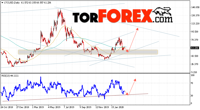 Дополнительным сигналом в пользу роста котировок LTC/USD на текущей торговой неделе 9 — 13 марта 2020 выступит тест линии тренда на индикаторе относительной силы. Вторым сигналом станет отскок от нижней границы восходящего канала. Отменой варианта роста Litecoin станет падение и пробой области 42.05. Это укажет на пробой области поддержки и продолжение падения курса LTC/USD и падение ниже уровня 30.05. Подтверждением роста криптовалюты выступит пробой области сопротивления и закрытие котировок выше уровня 80.05.
