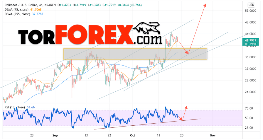 Таким образом, Polkadot прогноз криптовалют на 19 октября 2021 предполагает попытку коррекции и тест области поддержки вблизи уровня 37.05. Откуда стоит ожидать отскок и продолжения роста DOT/USD в область выше уровня 54.05. Дополнительным сигналом в пользу подъёма Polkadot выступит тест линии тренда на индикаторе относительной силы. Отменой варианта роста станет падение и пробой области 31.05. Это укажет на продолжение снижения криптовалюты с целью ниже уровня 25.05.