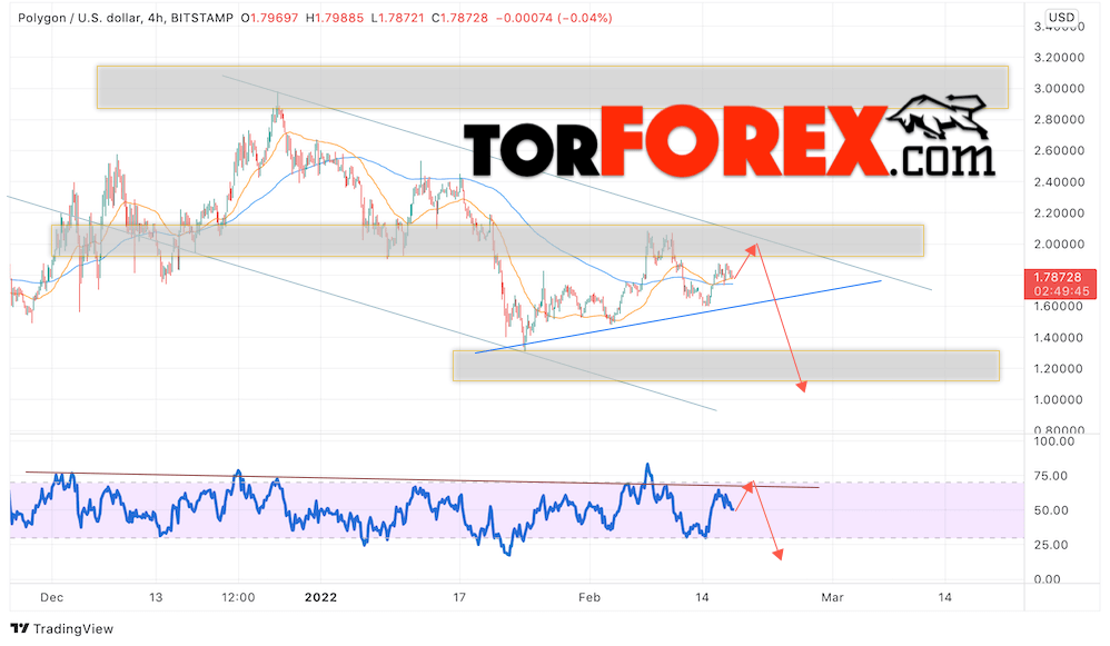 Дополнительным сигналом в пользу снижения котировок MATIC/USD выступит тест линии сопротивления на индикаторе относительной силы. Вторым сигналом станет отскок от верхней границы нисходящего канала, а также от верхней границы модели ”Голова и плечи”. Отменой варианта снижения монеты станет сильный рост стоимости актива и пробой области 2.2500. Это укажет на пробой области сопротивления и продолжение подъёма курса криптовалюты с потенциальной целью выше уровня 2.9500. С пробоем области поддержки и закрытием котировок ниже уровня 1.4055 стоит ожидать подтверждения развития нисходящего импульса по Polygon и отработку модели ”Голова и плечи”.