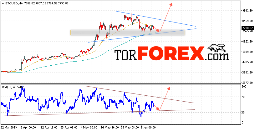 Котировки Bitcoin BTC/USD торгуются на уровне 7790 и продолжают движение в рамках коррекции и формирования модели «Треугольник». Капитализация криптовалюты в момент публикации прогноза составляет $138 926 135 307. Скользящие средние указывают на наличие восходящей тенденции по Bitcoin. В рамках прогноза курса криптовалюты на завтра 12 июня 2019 стоит ожидать попытку снижения и тест уровня поддержки вблизи области 7525. Откуда вновь стоит ожидать отскок и попытку продолжения роста курса Bitcoin с целью выше области 9465.