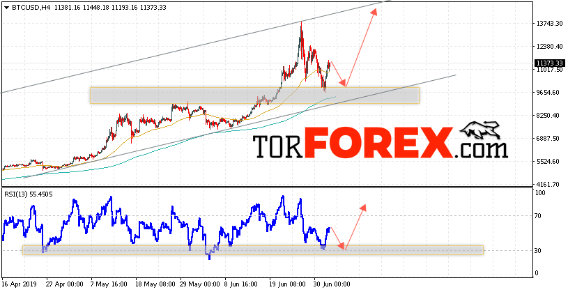 Таким образом, BTC/USD прогноз курса Bitcoin на 4 июля 2019 предполагает попытку теста уровня поддержки вблизи области 9750. И далее продолжение роста криптовалюты с потенциальной целью на уровне 13750. Дополнительным сигналом в пользу снижения курса Bitcoin выступит тест нисходящей линии тренда на индикаторе относительной силы. Отменой варианта падения криптовалюты станет сильный рост и пробой области 8250. Это укажет на продолжение подъёма с потенциальной целью выше 7250.