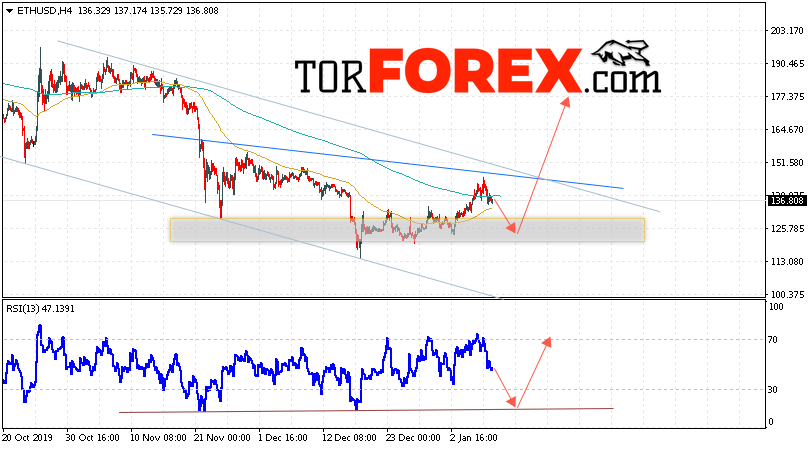 Таким образом, ETH/USD прогноз курса Ethereum на 10 января 2020 предполагает попытку коррекции и тест области поддержки вблизи уровня 125.15. Откуда стоит ожидать отскок и продолжения роста криптовалюты ETH/USD в область выше уровня 180.05. Дополнительным сигналом в пользу роста Ethereum выступит тест линии тренда на индикаторе относительной силы. Отменой варианта подъёма цифровой валюты станет пробой области 115.05. Что укажет на продолжение падения с потенциальной целью ниже уровня 90.05.