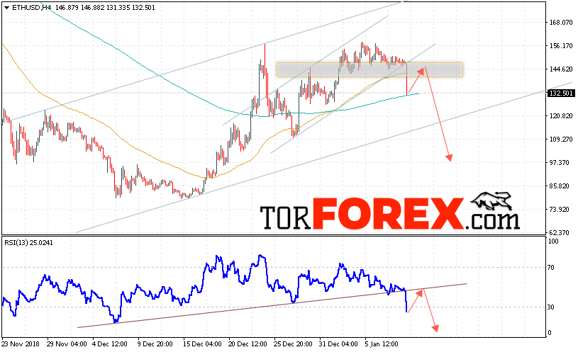 Дополнительным сигналом в пользу падения котировок ETH/USD выступит тест пробитой линии тренда на индикаторе относительной силы. А также отскок от нижней границы восходящего канала. Отменой варианта падения криптовалюты станет сильный рост и пробой уровня 155. Это укажет на пробой сопротивления и продолжение падения котировок ETH/USD выше уровня 175. С пробоем области поддержки и закрытием котировок ниже уровня 125 стоит ожидать ускорения развития нисходящего движения по Ethereum.