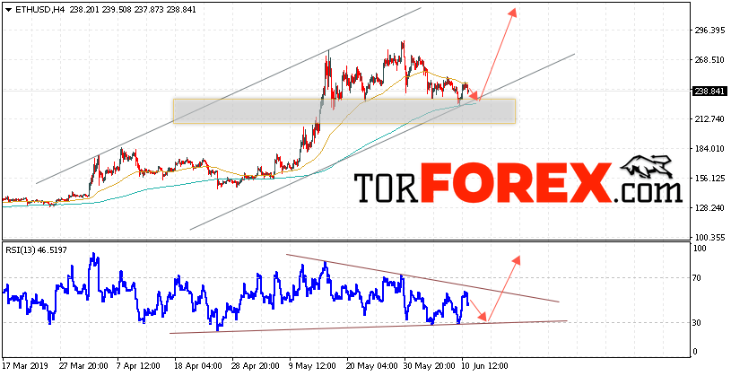 Таким образом, ETH/USD прогноз курса Ethereum на 12 июня 2019 предполагает попытку теста области поддержки вблизи уровня 235. Откуда стоит ожидать отскок и продолжения роста криптовалюты ETH/USD в область выше уровня 310. Дополнительным сигналом в пользу подъёма Ethereum выступит тест линии тренда на индикаторе относительной силы. Отменой варианта роста цифровой валюты выступит пробой области 205. Что укажет на продолжение падения с потенциальной целью ниже уровня 185.