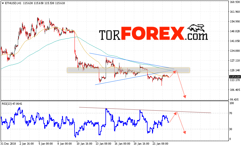 Дополнительным сигналом в пользу падения котировок ETH/USD выступит тест нисходящей линии тренда на индикаторе относительной силы. А также отскок от нижней границы модели «Треугольник». Отменой варианта падения криптовалюты станет сильный рост и пробой уровня 130. Это укажет на пробой сопротивления и продолжение падения котировок ETH/USD выше уровня 155. С пробоем области поддержки и закрытием котировок ниже уровня 105 стоит ожидать ускорения развития нисходящего движения по Ethereum.