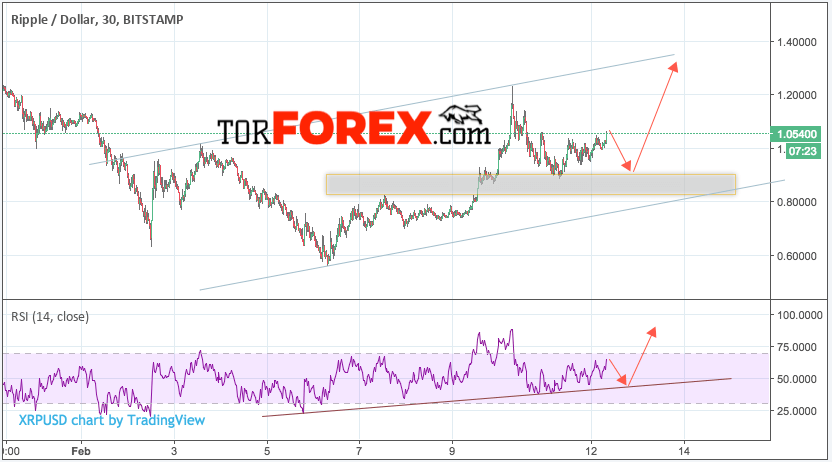 Таким образом, Ripple прогноз и аналитика на 13 февраля 2018 предполагает попытку теста уровня поддержки вблизи 0.95, откуда стоит ожидать рост криптовалюты с потенциальной целью на уровне 1.25, дополнительным сигналом в пользу роста Ripple выступит тест линии тренда на индикаторе относительной силы.