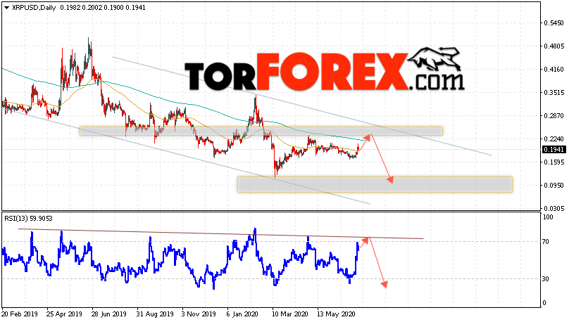 Дополнительным сигналом в пользу снижения котировок XRP/USD на текущей торговой неделе 13 — 17 июля 2020 выступит тест линии сопротивления на индикаторе относительной силы. Вторым сигналом станет отскок от верхней границы нисходящего канала. Отменой варианта падения криптовалюты Ripple станет сильный рост цен и пробой области 0.2705. Это укажет на пробой области сопротивления и продолжение роста котировок XRP/USD с целью выше уровня 0.3305. Подтверждением падения криптовалюты выступит пробой области поддержки и закрытие котировок ниже области 0.1465.