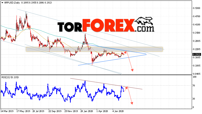 Дополнительным сигналом в пользу снижения котировок XRP/USD на текущей торговой неделе 20 — 24 июля 2020 выступит тест линии сопротивления на индикаторе относительной силы. Вторым сигналом станет отскок от верхней границы нисходящего канала. Отменой варианта падения криптовалюты Ripple станет сильный рост цен и пробой области 0.2705. Это укажет на пробой области сопротивления и продолжение роста котировок XRP/USD с целью выше уровня 0.3225. Подтверждением падения криптовалюты выступит пробой области поддержки и закрытие котировок ниже области 0.1465.