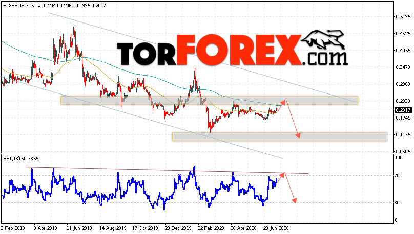 Дополнительным сигналом в пользу снижения котировок XRP/USD на текущей торговой неделе 27 — 31 июля 2020 выступит тест линии сопротивления на индикаторе относительной силы. Вторым сигналом станет отскок от верхней границы нисходящего канала. Отменой варианта падения криптовалюты Ripple станет сильный рост цен и пробой области 0.2855. Это укажет на пробой области сопротивления и продолжение роста котировок XRP/USD с целью выше уровня 0.3435. Подтверждением падения криптовалюты выступит пробой области поддержки и закрытие котировок ниже области 0.1525.