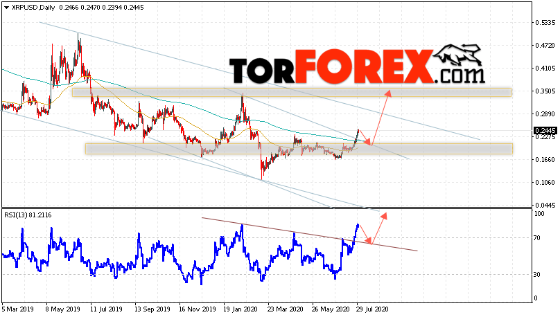 Дополнительным сигналом в пользу снижения котировок XRP/USD на текущей торговой неделе 3 — 7 августа 2020 выступит тест линии сопротивления на индикаторе относительной силы. Вторым сигналом станет отскок от верхней границы нисходящего канала. Отменой варианта падения криптовалюты Ripple станет сильный рост цен и пробой области 0.2855. Это укажет на пробой области сопротивления и продолжение роста котировок XRP/USD с целью выше уровня 0.3435. Подтверждением падения криптовалюты выступит пробой области поддержки и закрытие котировок ниже области 0.1525.