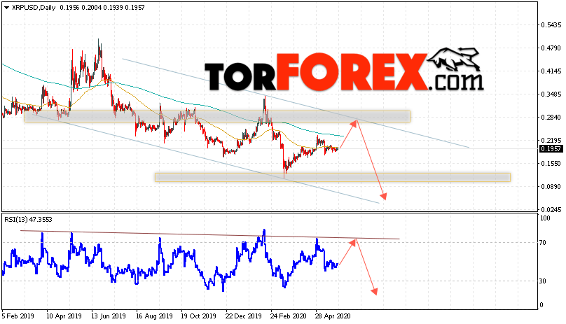 Дополнительным сигналом в пользу снижения котировок XRP/USD на текущей торговой неделе 1 — 5 июня 2020 выступит тест линии сопротивления на индикаторе относительной силы. Вторым сигналом станет отскок от верхней границы нисходящего канала. Отменой варианта падения криптовалюты Ripple станет сильный рост цен и пробой области 0.2765. Это укажет на пробой области сопротивления и продолжение роста котировок XRP/USD с целью выше уровня 0.3505. Подтверждением падения криптовалюты выступит пробой области поддержки и закрытие котировок ниже области 0.1565.