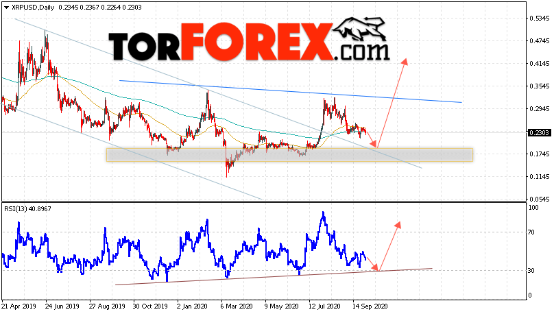 Дополнительным сигналом в пользу роста котировок XRP/USD на текущей торговой неделе неделю 5 — 9 октября 2020 выступит тест линии поддержки на индикаторе относительной силы. Вторым сигналом станет завершение формирования разворотной модели ”Голова и плечи”. Отменой варианта роста криптовалюты Ripple станет падение цен и пробой области 0.1175. Это укажет на пробой области поддержки и продолжение падения котировок XRP/USD с целью ниже уровня 0.0845. Подтверждением роста криптовалюты выступит пробой области сопротивления и закрытие котировок выше области 0.3505, что укажет на завершение формирования модели и полноценную отработку разворотного паттерна.