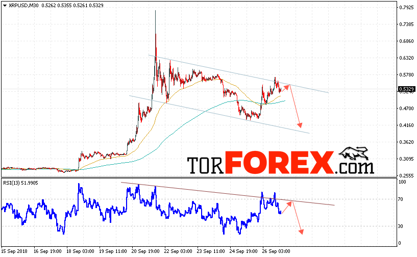 Таким образом, Криптовалюта Ripple прогноз курса на 27 сентября 2018 предполагает попытку теста уровня сопротивления вблизи области 0.5450, откуда стоит ожидать продолжения снижения криптовалюты с потенциальной целью на уровне 0.4160, дополнительным сигналом в пользу падения Ripple выступит тест линии тренда на индикаторе относительной силы, отменой варианта снижения котировок станет сильный рост и пробой области 0.5850, в этом случае стоит ожидать продолжения развития восходящей тенденции по цифровой валюте.