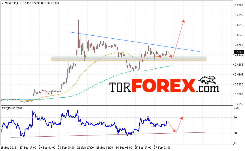 Таким образом, Криптовалюта Ripple прогноз курса на 28 сентября 2018 предполагает попытку теста уровня поддержки вблизи области 0.5050, откуда стоит ожидать продолжения роста криптовалюты с потенциальной целью на уровне 0.7050, дополнительным сигналом в пользу роста Ripple выступит тест линии тренда на индикаторе относительной силы, отменой варианта роста котировок станет падение и пробой области 0.4550, в этом случае стоит ожидать продолжения развития нисходящей тенденции по цифровой валюте.