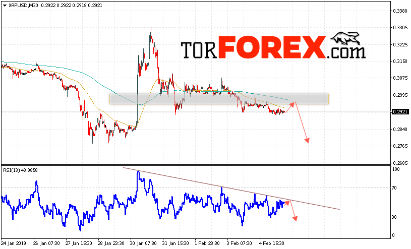 Таким образом, Криптовалюта Ripple прогноз курса на 6 февраля 2019 предполагает попытку теста уровня сопротивления вблизи области 0.3000. Откуда стоит ожидать продолжения падения криптовалюты с потенциальной целью на уровне 0.2765. Дополнительным сигналом в пользу снижения Ripple выступит тест линии тренда на индикаторе относительной силы. Отменой варианта падения котировок станет сильный рост и пробой области 0.3055. В этом случае стоит ожидать продолжения развития восходящей тенденции по цифровой валюте с целью выше 0.3450.