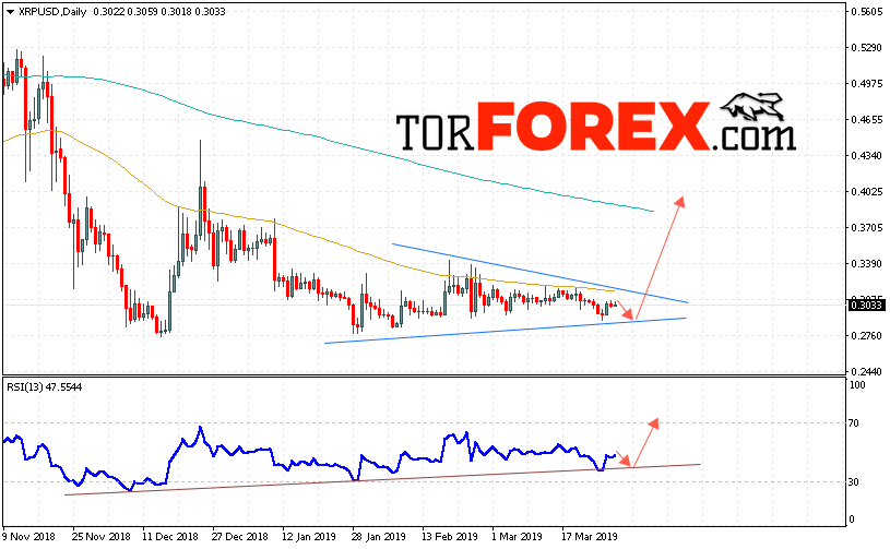 В пользу роста котировок XRP/USD на текущей торговой неделе 1 — 5 апреля 2019 выступит тест восходящей линии тренда на индикаторе относительной силы. Вторым сигналом станет отскок от нижней границы модели «Треугольник». Отменой варианта подъёма криптовалюты Ripple станет падение и пробой области 0.2735. Это укажет на пробой области поддержки и продолжение падения котировок XRP/USD. Подтверждением роста криптовалюты выступит пробой верхней границы модели «Треугольник» и закрытие котировок выше уровня 0.3125.