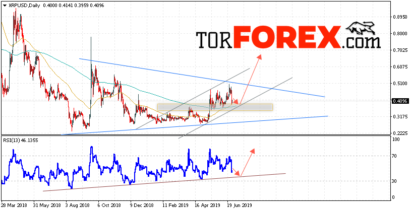 В пользу подъёма котировок XRP/USD на текущей торговой неделе 1 — 5 июля 2019 выступит тест восходящей линии тренда на индикаторе относительной силы. Вторым сигналом станет отскок от нижней границы восходящего канала. Отменой варианта роста криптовалюты Ripple станет падение и пробой области 0.3135. Это укажет на пробой области поддержки и продолжение снижения котировок XRP/USD. Подтверждением подъёма криптовалюты выступит пробой области сопротивления и закрытие котировок над уровнем 0.5185.