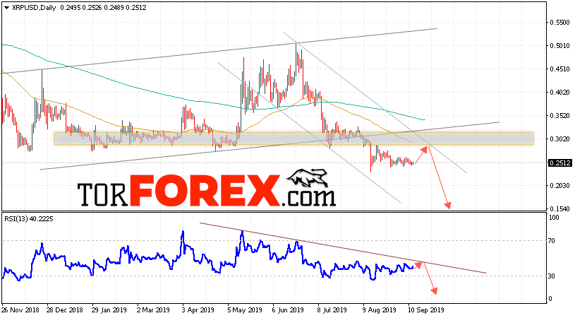 В пользу снижения котировок XRP/USD на текущей торговой неделе 16 — 20 сентября 2019 выступит тест нисходящей линии тренда на индикаторе относительной силы. Вторым сигналом станет отскок от верхней границы нисходящего канала. Отменой варианта падения криптовалюты Ripple станет сильный рост и пробой области 0.3515. Это укажет на пробой области сопротивления и продолжение роста котировок XRP/USD с целью выше уровня 0.3875. Подтверждением падения криптовалюты выступит пробой уровня поддержки и закрытие котировок ниже области 0.2245.
