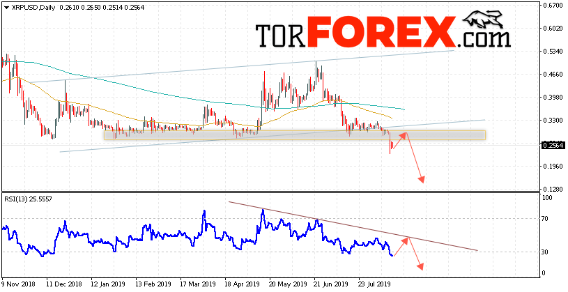 В пользу снижения котировок XRP/USD на текущей торговой неделе 19 — 23 августа 2019 выступит тест нисходящей линии тренда на индикаторе относительной силы. Вторым сигналом станет отскок от нижней границы восходящего канала. Отменой варианта падения криптовалюты Ripple станет сильный рост и пробой области 0.3450. Это укажет на пробой области сопротивления и продолжение роста котировок XRP/USD с целью выше уровня 0.3855. Подтверждением падения криптовалюты выступит пробой уровня поддержки и закрытие котировок ниже области 0.2005.