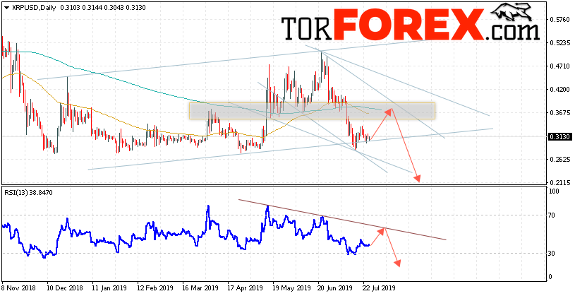 В пользу снижения котировок XRP/USD на текущей торговой неделе 29 июля — 2 августа 2019 выступит тест нисходящей линии тренда на индикаторе относительной силы. Вторым сигналом станет отскок от верхней границы нисходящего канала. Отменой варианта падения криптовалюты Ripple станет сильный рост и пробой области 0.4145. Это укажет на пробой области сопротивления и продолжение подъёма котировок XRP/USD с целью выше уровня 0.4755. Подтверждением снижения криптовалюты выступит пробой нижней границы восходящего канала и закрытие котировок под уровнем 0.2650.