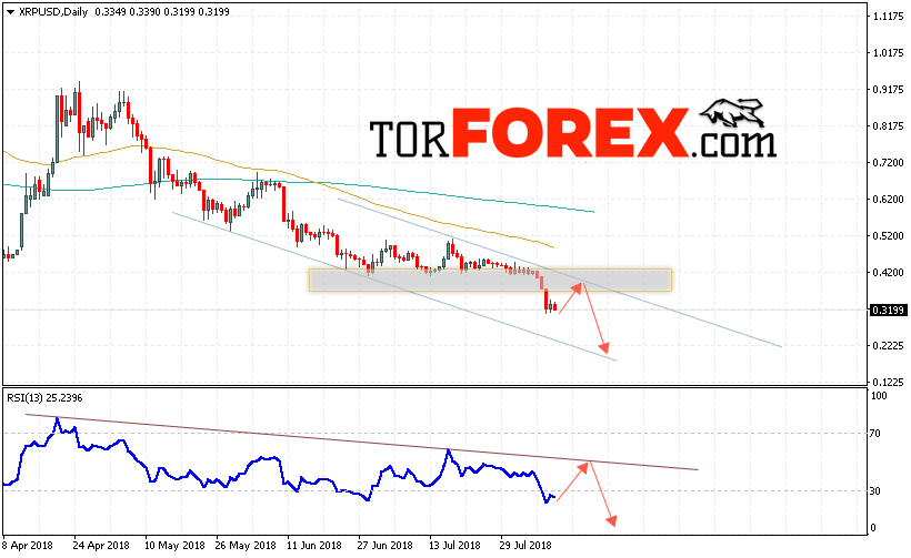 В пользу снижения котировок XRP/USD выступит тест нисходящей линии тренда на индикаторе относительной силы, а также тест верхней границы нисходящего канала. Отменой варианта падения криптовалюты Ripple станет сильный рост и пробой области 0.4350, что укажет на пробой верхней границы канала и продолжение роста котировок XRP/USD. Подтверждением снижения криптовалюты выступит пробой области поддержки и закрытие котировок ниже уровня 0.30.