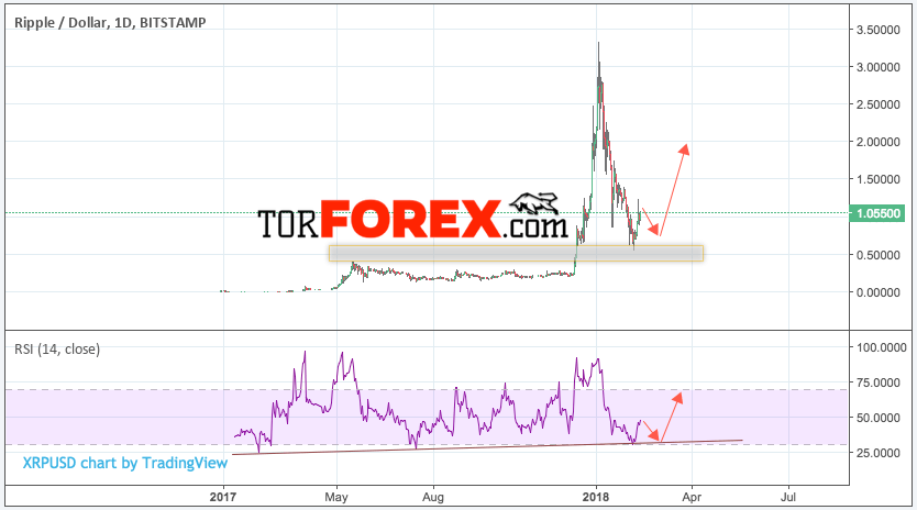 Таким образом, Ripple прогноз на неделю 12 — 16 февраля 2018 предполагает попытку теста уровня поддержки вблизи 0.95, откуда стоит ожидать рост криптовалюты с потенциальной целью на уровне 2.00, дополнительным сигналом в пользу роста Ripple выступит тест линии тренда на индикаторе относительной силы.