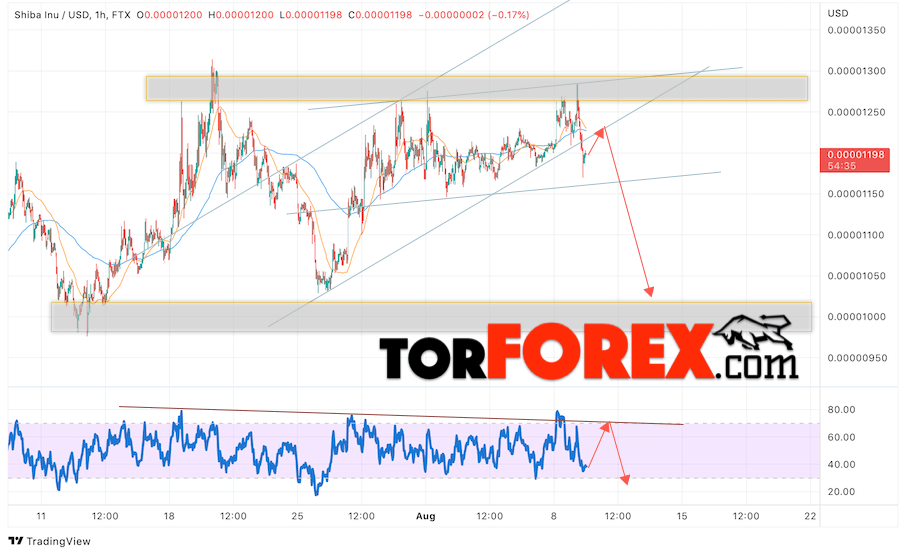 Дополнительным сигналом в пользу падения котировок SHIB/USD на завтра выступит отскок от линии сопротивления на индикаторе относительной силы. Вторым сигналом станет отскок от нижней границы бычьего канала. Отменой варианта снижения криптовалюты SHIBA INU станет сильный рост и пробой области 0.00001355. Это укажет на пробой области сопротивления и продолжение подъёма котировок SHIB/USD с целью выше уровня 0.00001755. Подтверждением падению криптовалюты выступит пробой области поддержки и закрытие котировок ниже уровня 0.00001105, что укажет на пробой нижней границы бычьего канала.