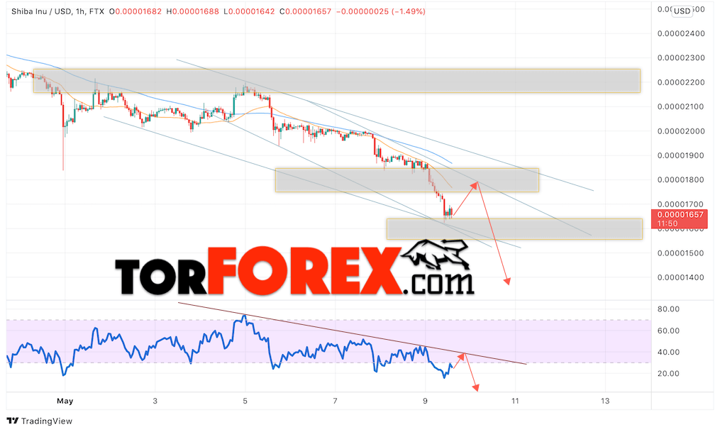 Дополнительным сигналом в пользу падения котировок SHIB/USD на завтра выступит отскок от линии сопротивления на индикаторе относительной силы. Вторым сигналом станет отскок от верхней границы нисходящего канала. Отменой варианта падения криптовалюты SHIBA INU станет сильный рост и пробой области 0.00001975. Это укажет на пробой области сопротивления и продолжение подъёма котировок SHIB/USD с целью выше уровня 0.00002005. Подтверждением падению криптовалюты выступит пробой области поддержки и закрытие котировок ниже уровня 0.00001575.