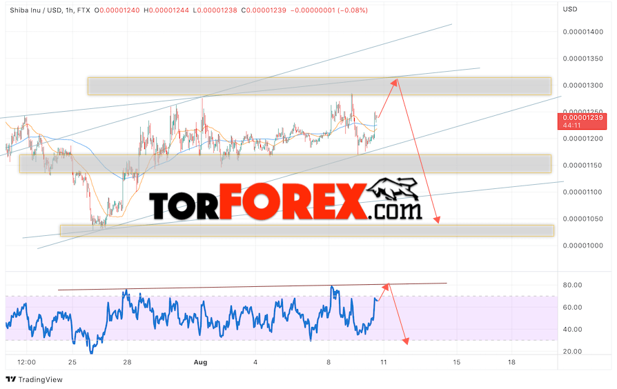 SHIBA INU торгуется в момент публикации прогноза на уровне 0.00001239, продолжают движение в рамках коррекции и бычьего канала. Скользящие средние указывают на наличие краткосрочной медвежьей тенденции по монете. Цены пробили область между сигнальными линиями вверх, что указывает на давление со стороны покупателей монеты и потенциальное продолжение роста уже с текущих уровней. В рамках прогноза курса SHIB/USD стоит рассматривать попытку развития бычьей коррекции стоимости цифрового актива и тест области сопротивления вблизи уровня 0.00001295. Откуда вновь ожидается отскок вниз и попытка продолжения падения криптовалюты SHIBA INU с потенциальной целью ниже уровня 0.00001045.
