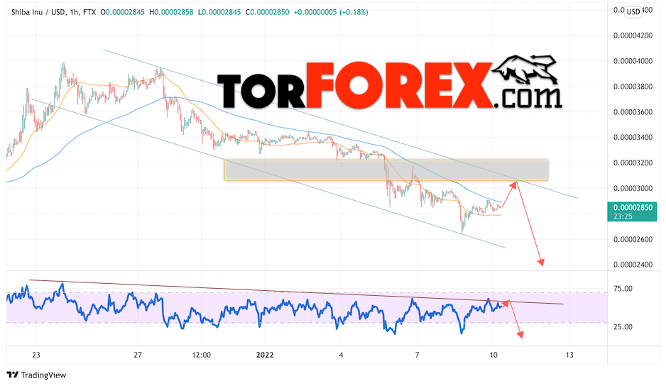 SHIBA INU торгуется в момент публикации прогноза на уровне 0.00002850, продолжают движение в рамках коррекции и нисходящего канала. Скользящие средние указывают на наличие краткосрочной медвежьей тенденции по монете. Цены вновь тестируют область между сигнальными линиями, что указывает на давление со стороны продавцов монеты и потенциальное продолжение падения уже с текущих уровней. В рамках прогноза курса SHIB/USD на стоит рассматривать попытку развития бычьей коррекции стоимости цифрового актива и тест области сопротивления вблизи уровня 0.00003005. Откуда вновь ожидается отскок вниз и попытка продолжения падения криптовалюты SHIBA INU с потенциальной целью ниже уровня 0.00002405.