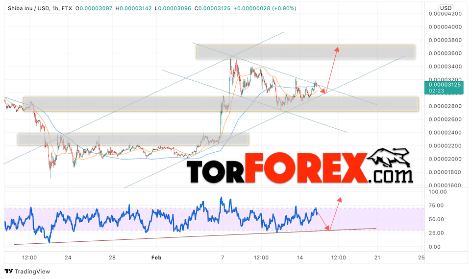 SHIBA INU торгуется в момент публикации прогноза на уровне 0.00003125, продолжают движение в рамках коррекции. Скользящие средние указывают на наличие краткосрочной медвежьей тенденции по монете. Цены вновь тестируют область между сигнальными линиями, что указывает на давление со стороны продавцов монеты и потенциальное продолжение падения уже с текущих уровней. В рамках прогноза курса SHIB/USD на стоит рассматривать попытку развития снижения стоимости цифрового актива и тест области поддержки вблизи уровня 0.00002905. Откуда вновь ожидается отскок вверх и попытка продолжения роста криптовалюты SHIBA INU с потенциальной целью выше уровня 0.00002905.