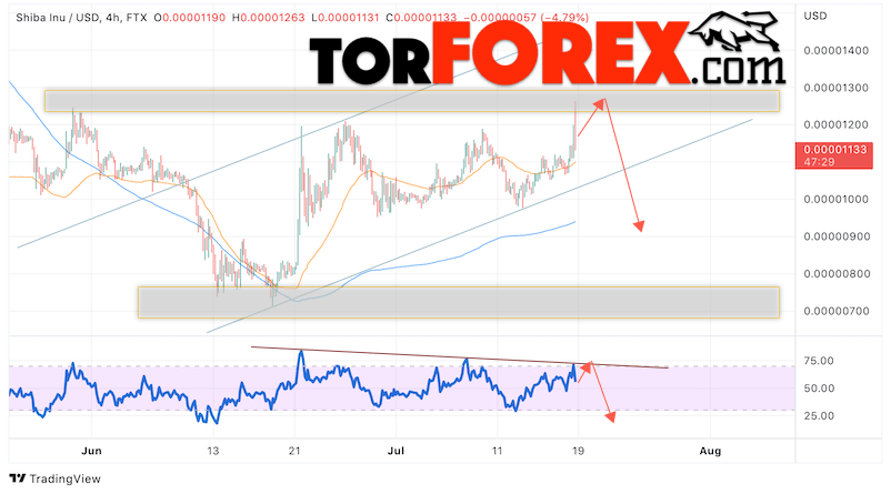 Таким образом, Shiba Inu прогноз курса на 19 июля 2022 предполагает попытку развития коррекции монеты и тест области сопротивления вблизи уровня 0.00001265. Затем, продолжение падения в область ниже уровня 0.00000905. Дополнительным сигналом в пользу падения SHIBA INU выступит тест линии тренда на индикаторе относительной силы (RSI). Отменой варианта снижения станет сильный рост и пробой области 0.00001405. Это укажет на продолжение подъёма криптовалюты с целью выше уровня 0.00001785.