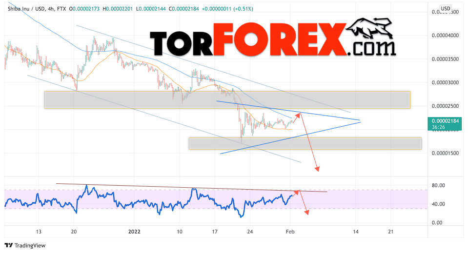 Таким образом, Shiba Inu прогноз курса на 2 февраля 2022 предполагает попытку развития коррекции монеты и тест области сопротивления вблизи уровня 0.00002235. Затем, продолжение падения в область ниже уровня 0.00001425. Дополнительным сигналом в пользу снижения SHIBA INU выступит тест линии тренда на индикаторе относительной силы (RSI). Отменой варианта падения станет сильный рост и пробой области 0.00002705. Это укажет на продолжение роста криптовалюты с целью выше уровня 0.00003215.