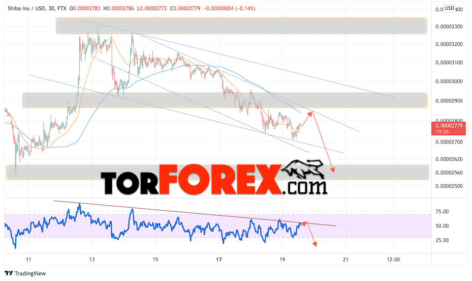 Дополнительным сигналом в пользу падения котировок SHIB/USD на завтра выступит отскок от нисходящей линии сопротивления на индикаторе относительной силы. Вторым сигналом станет отскок от верхней границы нисходящего канала. Отменой варианта падения криптовалюты SHIBA INU станет сильный рост и пробой области 0.00003005. Это укажет на пробой области сопротивления и продолжение роста котировок SHIB/USD с целью выше уровня 0.00003455. Подтверждением падению криптовалюты выступит пробой области поддержки и закрытие котировок ниже уровня 0.00002645, что укажет на пробой нижней границы нисходящего канала.