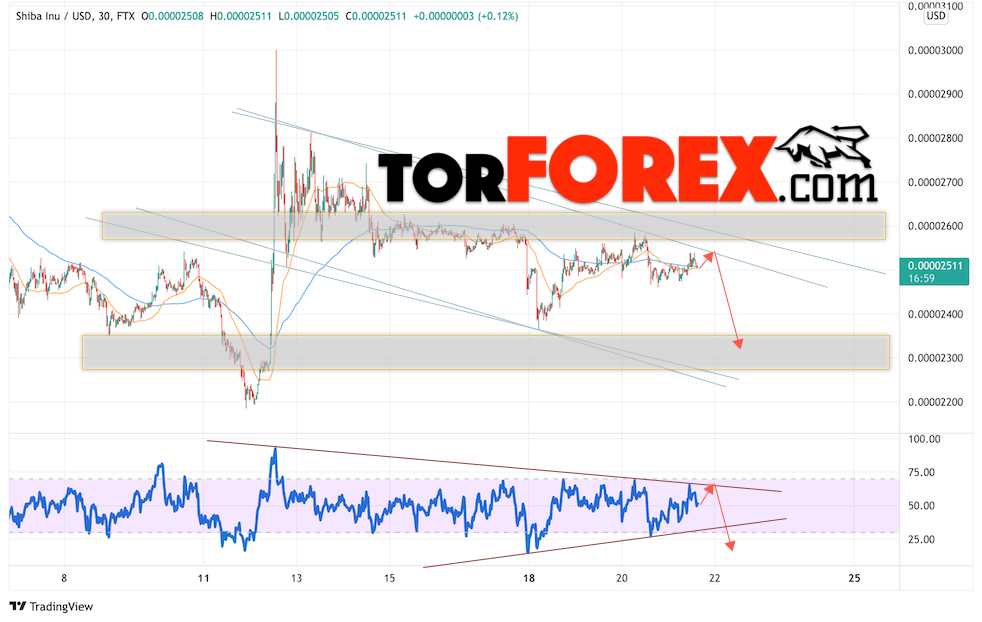 Дополнительным сигналом в пользу падения котировок SHIB/USD на завтра выступит отскок от линии сопротивления на индикаторе относительной силы. Вторым сигналом станет отскок от верхней границы медвежьего канала, а также от верхней границы модели ”Треугольник». Отменой варианта падения криптовалюты SHIBA INU станет сильный рост и пробой области 0.00002805. Это укажет на пробой области сопротивления и продолжение подъёма котировок SHIB/USD с целью выше уровня 0.00003145. Подтверждением падению криптовалюты выступит пробой области поддержки и закрытие котировок ниже уровня 0.00002285.