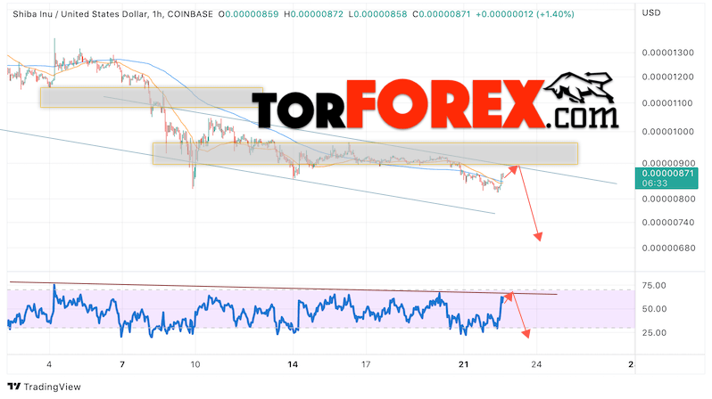 SHIBA INU торгуется в момент публикации прогноза на уровне 0.00000871, продолжают движение в рамках коррекции и нисходящего канала. Скользящие средние указывают на наличие краткосрочной медвежьей тенденции по монете. Цены пробили область сигнальными линиями вверх, что указывает на давление со стороны покупателей монеты и потенциальное продолжение роста уже с текущих уровней. В рамках прогноза курса SHIB/USD стоит рассматривать попытку развития бычьей коррекции стоимости цифрового актива и тест области сопротивления вблизи уровня 0.00000945. Откуда вновь ожидается отскок вниз и попытка продолжения падения криптовалюты SHIBA INU с потенциальной целью ниже уровня 0.00000675.