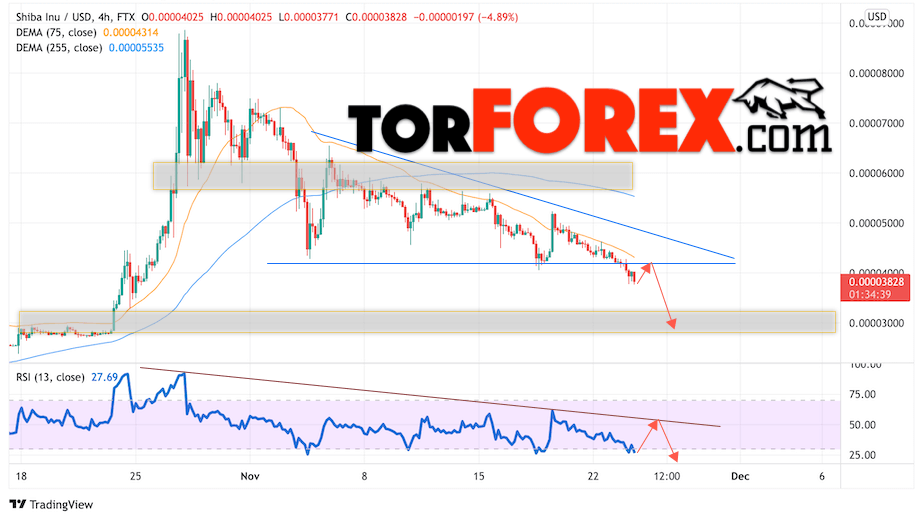 SHIBA INU торгуется в момент публикации прогноза на уровне 0.00003828, продолжают движение в рамках падения и начала отработки модели ”Треугольник”. Скользящие средние указывают на наличие медведей тенденции. Цены пробили область между сигнальными линиями вниз, что указывает на давление со стороны продавцов монеты и потенциальное продолжение падения уже с текущих уровней. В рамках прогноза курса SHIB/USD на стоит рассматривать попытку бычьей коррекции стоимости цифрового актива и тест области сопротивления вблизи уровня 0.00004005. Откуда вновь ожидается отскок вниз и попытка продолжения падения криптовалюты SHIBA INU с потенциальной целью ниже уровня 0.00003005.