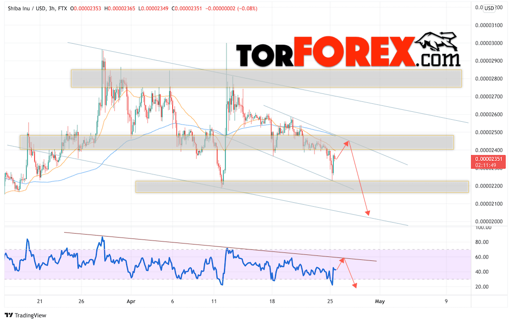 Таким образом, Shiba Inu прогноз курса на 26 апреля 2022 предполагает попытку развития коррекции монеты и тест области сопротивления вблизи уровня 0.00002445. Затем, продолжение падения в область ниже уровня 0.00002055. Дополнительным сигналом в пользу падения SHIBA INU выступит тест линии тренда на индикаторе относительной силы (RSI). Отменой варианта снижения станет сильный рост и пробой области 0.00002605. Это укажет на продолжение подъёма криптовалюты с целью выше уровня 0.00003205.