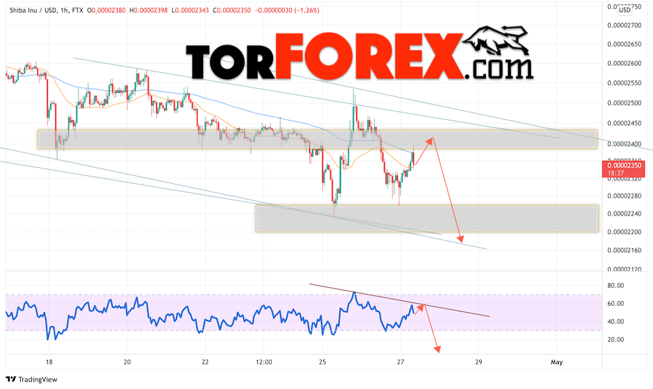 Дополнительным сигналом в пользу падения котировок SHIB/USD на завтра выступит отскок от линии сопротивления на индикаторе относительной силы. Вторым сигналом станет отскок от верхней границы медвежьего канала. Отменой варианта падения криптовалюты SHIBA INU станет сильный рост и пробой области 0.00002565. Это укажет на пробой области сопротивления и продолжение подъёма котировок SHIB/USD с целью выше уровня 0.00003005. Подтверждением падению криптовалюты выступит пробой области поддержки и закрытие котировок ниже уровня 0.00002245, как видим, было несколько отскоков от данной области вверх.