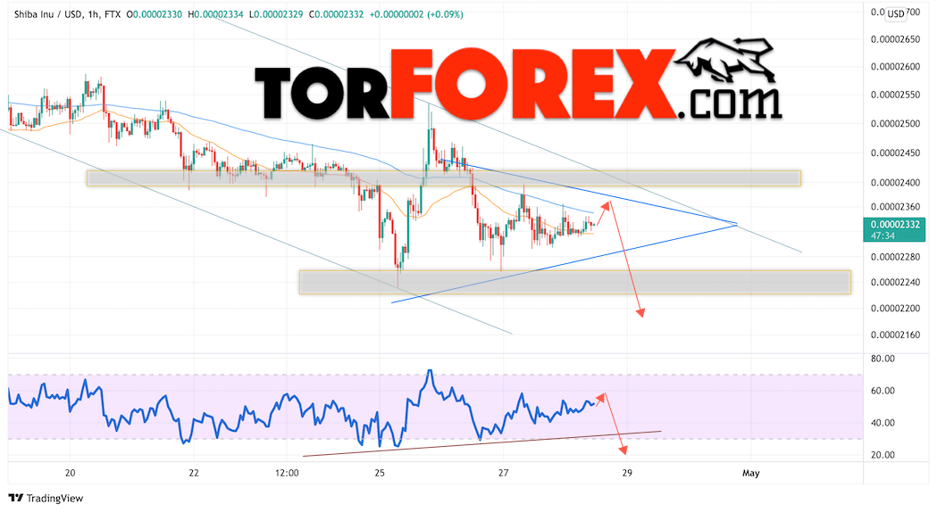 SHIBA INU торгуется в момент публикации прогноза на уровне 0.00002332, продолжают движение в рамках коррекции и формирования модели ”Треугольник”. Скользящие средние указывают на наличие краткосрочной нисходящей тенденции по монете. Цены тестируют область между сигнальными линиями, что указывает на давление со стороны продавцов монеты и потенциальное продолжение падения уже с текущих уровней. В рамках прогноза курса SHIB/USD стоит рассматривать попытку развития коррекции стоимости цифрового актива и тест области сопротивления вблизи уровня 0.00002355. Откуда вновь ожидается отскок вниз и попытка продолжения падения криптовалюты SHIBA INU с потенциальной целью ниже уровня 0.00002145.
