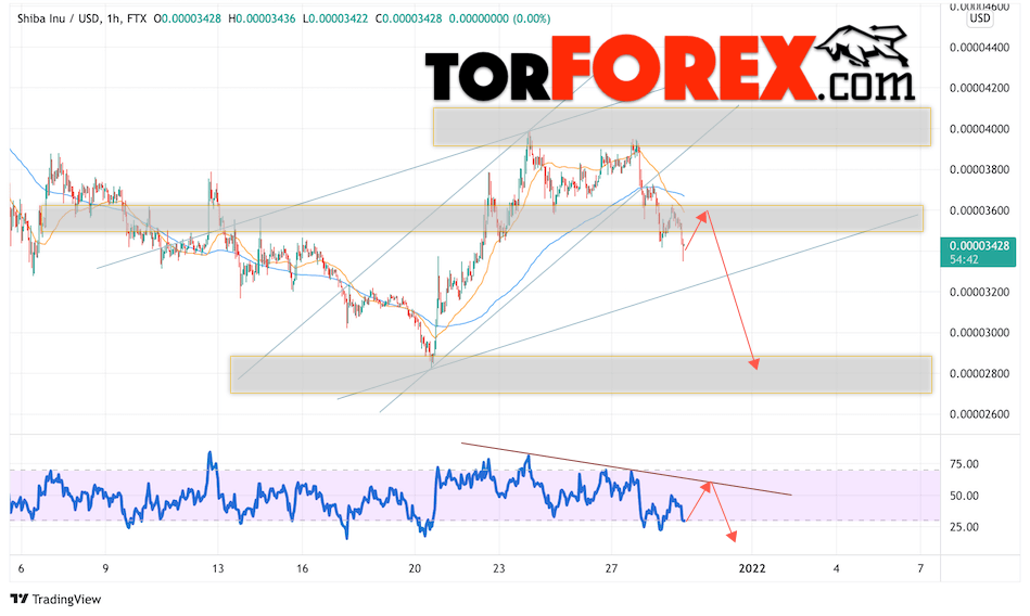 Дополнительным сигналом в пользу снижения котировок SHIB/USD на завтра выступит отскок от линии сопротивления на индикаторе относительной силы. Вторым сигналом станет отскок от нижней границы бычьего канала. Отменой варианта снижения криптовалюты SHIBA INU станет сильный рост и пробой области 0.00004055. Это укажет на пробой области сопротивления и продолжение роста котировок SHIB/USD с целью выше уровня 0.00005205. Подтверждением падению криптовалюты выступит пробой области поддержки и закрытие котировок ниже уровня 0.00003005, что укажет на пробой нижней границы бычьего канала коррекции.