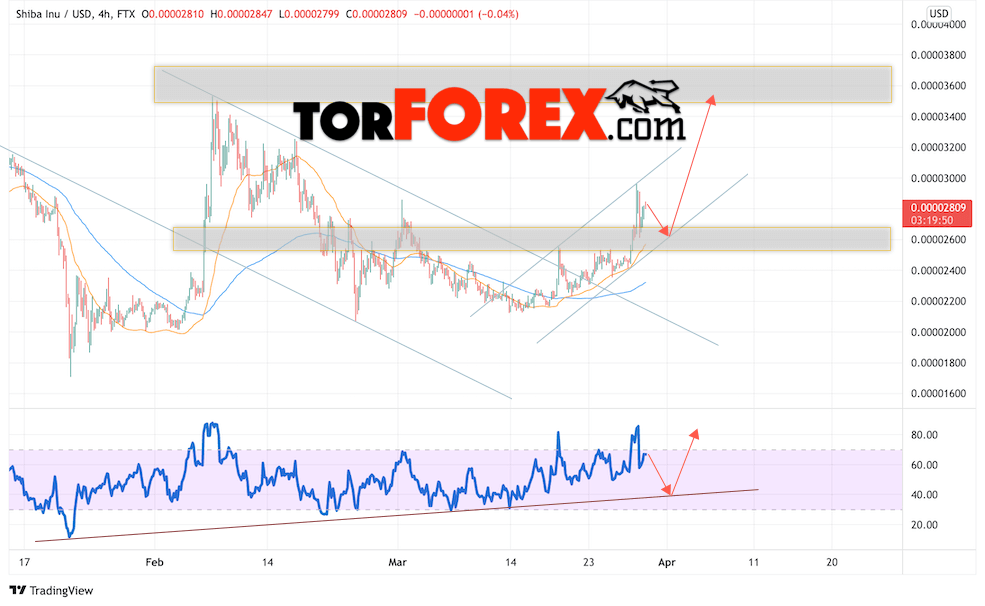 SHIBA INU торгуется в момент публикации прогноза на уровне 0.00002809, продолжают движение в рамках роста и бычьего канала. Скользящие средние указывают на наличие краткосрочной бычьей тенденции по монете. Цены ушли вверх от области между сигнальными линиями, что указывает на давление со стороны покупателей монеты и потенциальное продолжение роста уже с текущих уровней. В рамках прогноза курса SHIB/USD на стоит рассматривать попытку развития коррекции стоимости цифрового актива и тест области поддержки вблизи уровня 0.00002615. Откуда вновь ожидается отскок вверх и попытка продолжения роста криптовалюты SHIBA INU с потенциальной целью выше уровня 0.00003565.