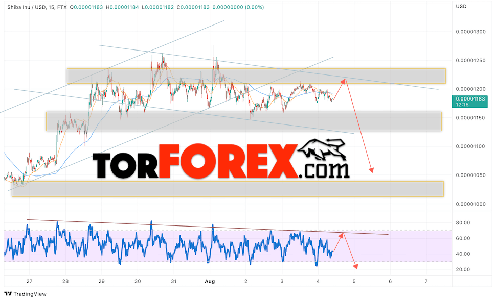 SHIBA INU торгуется в момент публикации прогноза на уровне 0.00001183, продолжают движение в рамках коррекции и нисходящего канала. Скользящие средние указывают на наличие краткосрочной медвежьей тенденции по монете. Цены пробили область между сигнальными линиями вниз, что указывает на давление со стороны продавцов монеты и потенциальное продолжение падения уже с текущих уровней. В рамках прогноза курса SHIB/USD стоит рассматривать попытку развития бычьей коррекции стоимости цифрового актива и тест области сопротивления вблизи уровня 0.00001225. Откуда вновь ожидается отскок вниз и попытка продолжения падения криптовалюты SHIBA INU с потенциальной целью ниже уровня 0.00001055.