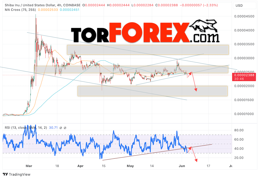 SHIBA INU торгуется в момент публикации прогноза на уровне 0.00002388, продолжают движение в рамках падения и покинули пределы бычьего канала коррекции. Скользящие средние указывают на наличие краткосрочной бычьей тенденции по монете. Цены пробили область сигнальными линиями вниз, что указывает на давление со стороны продавцов монеты и потенциальное продолжение падения уже с текущих уровней. В рамках прогноза курса SHIB/USD стоит рассматривать попытку развития бычьей коррекции стоимости цифрового актива и тест области сопротивления вблизи уровня 0.00002505. Откуда вновь ожидается отскок вниз и попытка продолжения падения криптовалюты SHIBA INU с потенциальной целью ниже уровня 0.00001805.